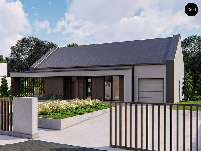 Z475 представляет собой одноэтажный дом с двускатной крышей и гаражом на одну машину.