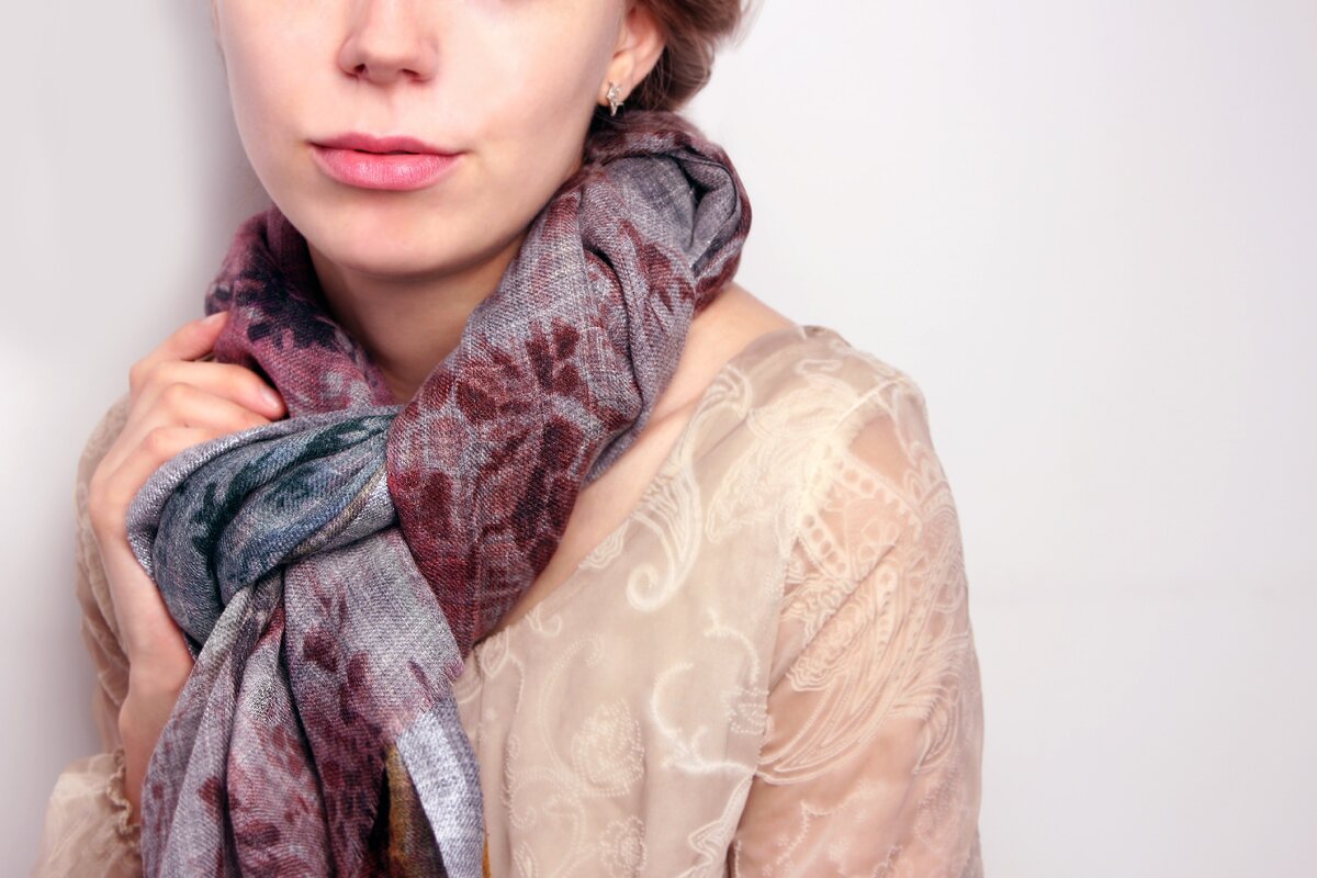 - Под крупное лицо подходят шарфы с крупным принтом, а под миниатюрное – с мелкими узорами.