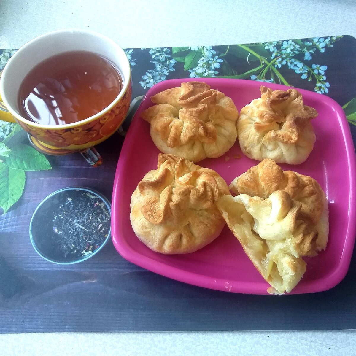 Тесто заранее достать из морозилки. Когда оно растает, добавить немного муки, чтобы не прилипало к рукам. Начинку нужно готовить непосредственно перед раскатыванием теста, иначе яблоки потемнеют. Тесто разделить на 16-18 частей и раскатать по очереди. В середину круга положить нарезанные кубиками яблоки (где-то 1-1,5 столовые ложки). Добавить неполную чайную ложку сахара и немного корицы. Скрепить края по кругу, чтобы получились мешочки. Дать немного постоять. В это время нагреть духовку до 180 градусов и поставить туда мешочки. Они должны стать красивого золотого цвета. У меня на это уходит 45 минут, но ориентируйтесь на свою плиту.