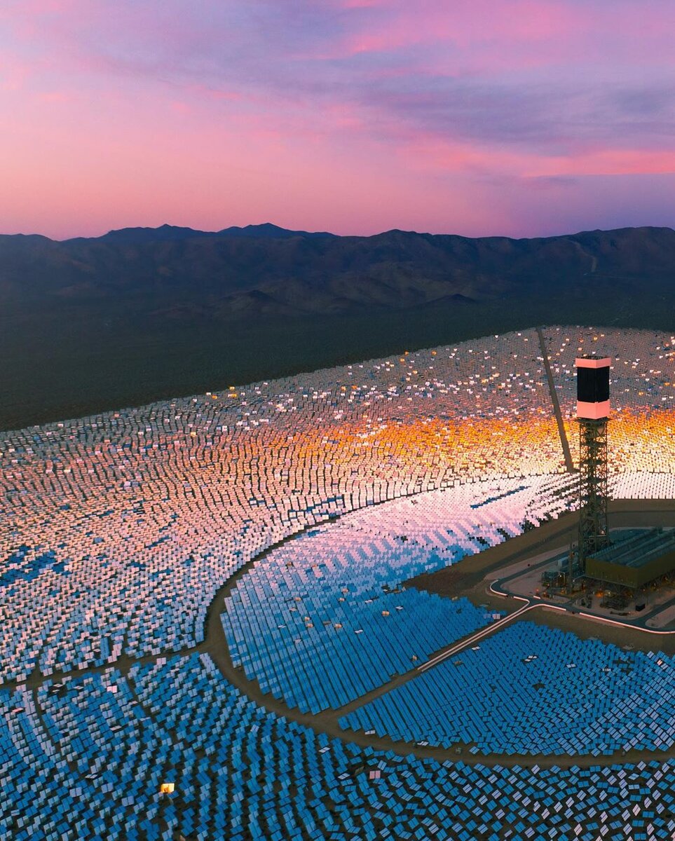 173 000 зеркал сфотографировал Зак Теста (Zach Testa). Нет, не в магазине IKEA, а в пустыне Калифорнии. Сначала кажется, что это разноцветные крыши, но на самом деле — крупнейшая солнечная установка в мире. Вместо привычных батарей используются обычные зеркала, позволяющие вырабатывать чистую энергию. Как же они красивы на рассвете! Хочется дождаться заката и снова наслаждаться мягким солнечным движением, преображающим все вокруг.