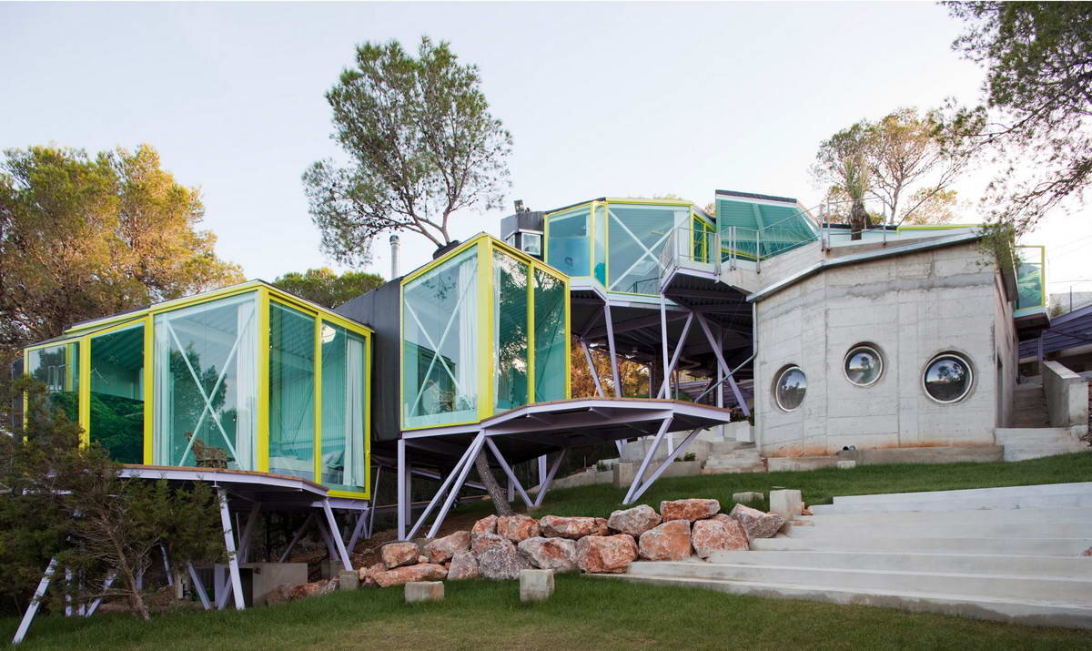 Вилла Террамар (Villa Terramar) в Испании от Andres Jaque Architects. Этот необычный дом построен на верху одного из прибрежных лесистых холмов в испанской Ибице. Дом выполнен в металлических конструкциях, расположенных на слегка наклонном участке. Основная часть с гостиной, столовой, кухней и двумя спальнями находится вверху и открывается на террасу с открытым бассейном. Ещё две отдельные спальни (гостевой домик) расположены чуть ниже. Пятая спальня устроена в бетонном помещении под бассейном. Архитектура дома выполнена в легкомысленной игривой стилистике и пытается отразить экологическое богатство острова, качественные стандарты европейского жилища и гедонистические традиции пригородных бассейнов Санта-Моники. Название: Вилла Террамар (Villa Terramar)