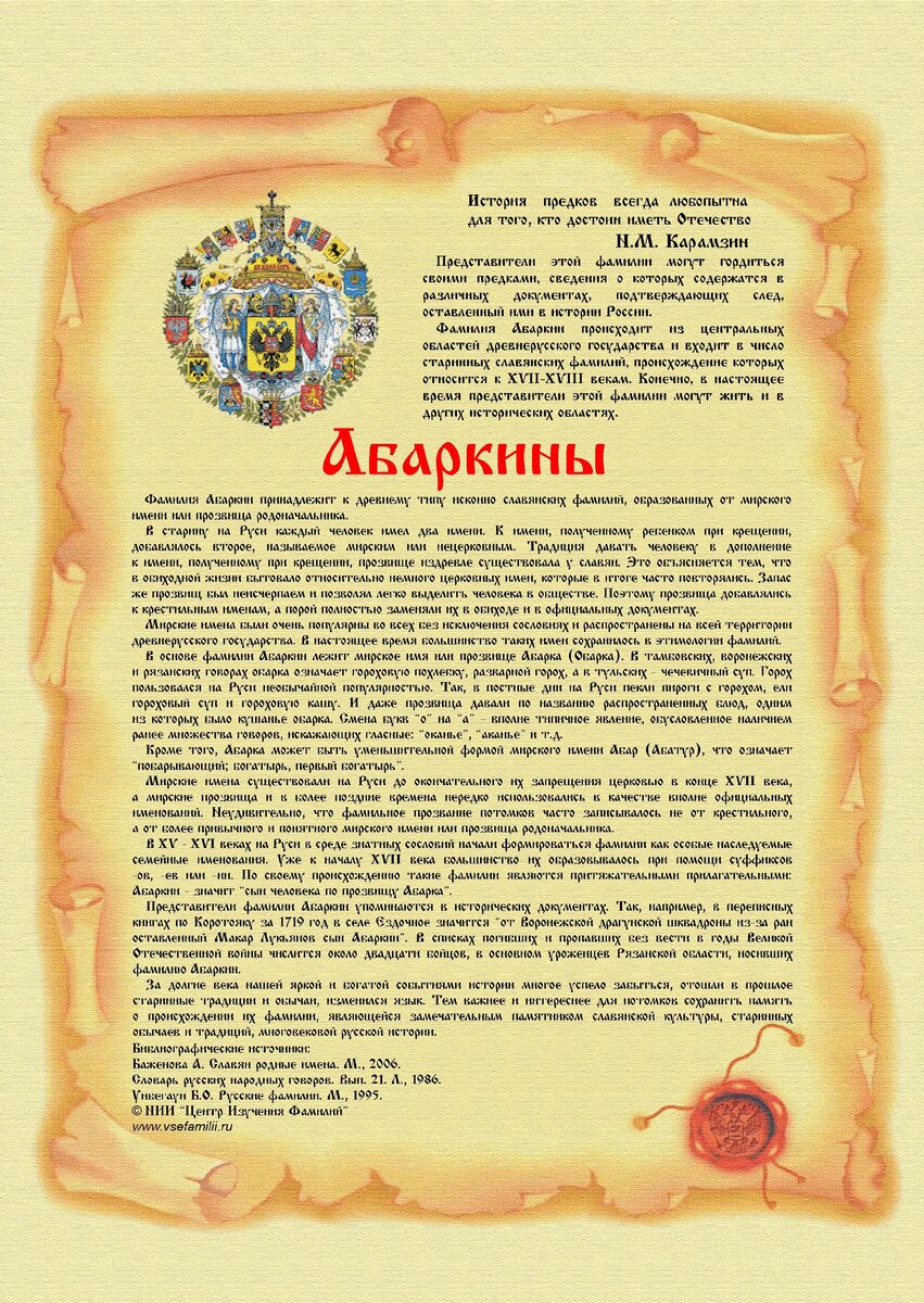 В XV - XVI веках на Руси в среде знатных сословий начали формироваться фамилии как особые наследуемые семейные именования. Уже к началу XVII века большинство их образовывалось при помощи суффиксов -ов, -ев или -ин. По своему происхождению такие фамилии являются притяжательными прилагательными: Абаркин - значит «сын человека по прозвищу Абарка».