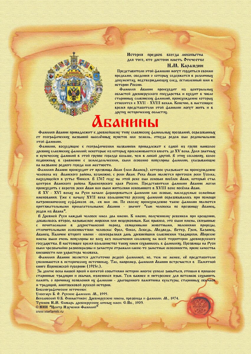 Фамилия Абанин принадлежит к древнейшему типу славянских фамильных прозваний, образованных от географических названий населённых пунктов или земель, откуда родом был родоначальник этой фамилии. Фамилии, восходящие к географическим названиям принадлежат к одной из групп наиболее древних славянских фамилий; некоторые из которых прослеживаются вплоть до XV века. Доля знатных и купеческих фамилий в этой группе гораздо больше, чем в любой другой. В этих сословиях, более подвижных в сравнении с земледельческим, были особенно популярны фамилии, указывающие на название родного города или местности. Фамилия Абанин происходит от прозвища Абан (или Абанец), которое указывает на происхождение человека – родом из Абан. Река Абан является притоком реки Усолка, находящейся в устье Енисея. В 1762 году на этой реке был основан посёлок Абан, который стал центром А́банского района Красноярского края России. Представители фамилии Абанин могли происходить с берегов реки Абан или были жителями основанного в