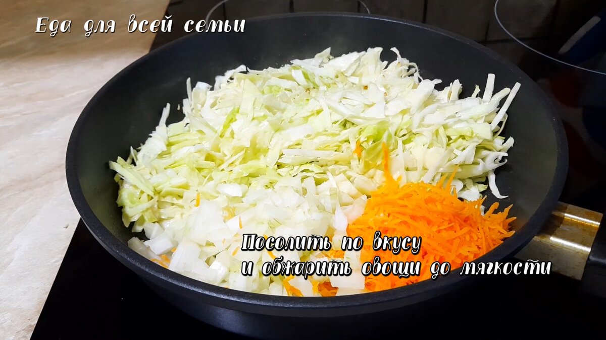 1. Сделать начинку. Обжарить на среднем огне мелко порезанную капусту, лук, и натертую на мелкой терке морковь. Начинку приправить солью, специями, еще я немного добавляю сахар, буквально 1 ч.л. Смотрите фото в галерее👇👇👇
