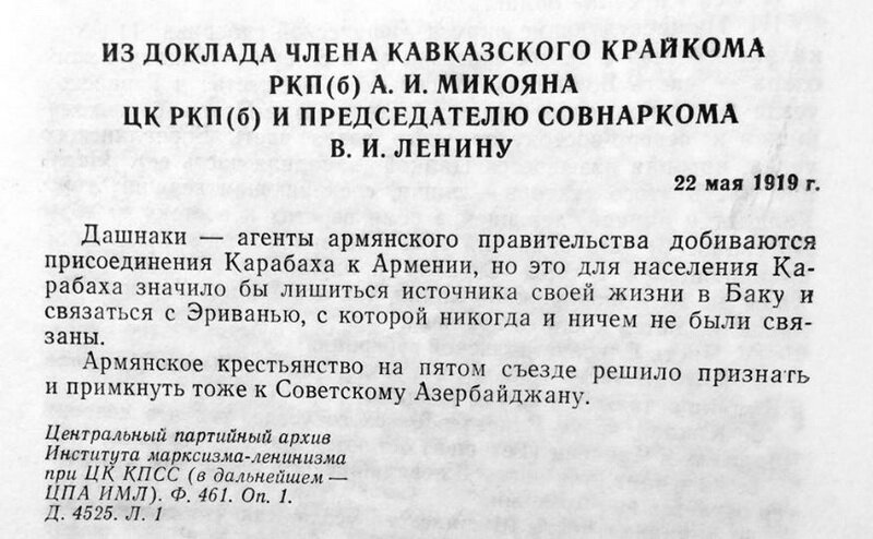 Что же касается Карабаха, Микоян затронул эту тему в контексте взаимоотношений, как он писал, "национально-буржуазных правительств" Азербайджана и Армении. Однако, касаясь информации о том, что V съезд армян Карабаха якобы признал и примкнул к Советскому Азербайджану, Микоян явно переборщил. Во-первых, в мае 1919 года Советского Азербайджана ещё не было. Во-вторых, как становится известно из архивных документов, ныне публикуемых в разных армянских сборниках по Нагорному Карабаху, V армянский съезд, который прошел 23-24 апреля 1919 года, принял диаметрально противоположное решение, т.е. о неприемлемости власти азербайджанского правительства в какой бы то ни было форме.Безусловно, подобное решение было принято под давлением Армении и её агентов в Нагорном Карабахе, которые, свив себе здесь теплые гнезда, держали армянское население под постоянным страхом, пытаясь преподнести изуверские планы дашнаков как чаяния народа.Микоян говорил правду, когда писал, что Карабах был тесно связан с Баку, а не с Эриваном, имея в виду Азербайджан, а не Армению. Однако не надо завышать планку симпатий Микояна к Азербайджану. Указывая на связь Карабаха именно с Баку, Микоян, прежде всего, отмечал значение последнего с его нефтью и самым многочисленным и многонациональным на Кавказе пролетариатом для стратегических планов большевиков. К тому же, немалую часть пролетариата Баку, наряду с русскими и азербайджанцами, составляли армяне, в т.ч. карабахские, приезжавшие сюда на заработки. Предлагая присоединить Карабах именно к Азербайджану, как главному плацдарму большевистской экспансии на Кавказе, Микоян рассчитывал на то, что после советизации Азербайджана и Армении государственные границы между ними будут упразднены и вопрос о принадлежности Карабаха таким образом отпадет сам собой.В мемуарах А.Микоян приводит воспоминания Берцинской о том, как прореагировал В.Ленин на ту часть письма Микояна от 22 мая 1919 года, где он упоминает о съезде армян в Карабахе. Ленин сказал: "Товарищ Микоян пишет о крестьянском съезде в Ка-абахе (Ленин картавил - И.Н.). Где Ка-абах, искал - не нашел? Тут же на стене в кабинете висела большая карта Закавказья. Тигран показывал Владимиру Ильичу пункты, где в то время происходили важные для Закавказья события"."Ленин сказал: "Товарищ Микоян пишет о крестьянском съезде в Ка-абахе. Где Ка-абах, искал - не нашел"