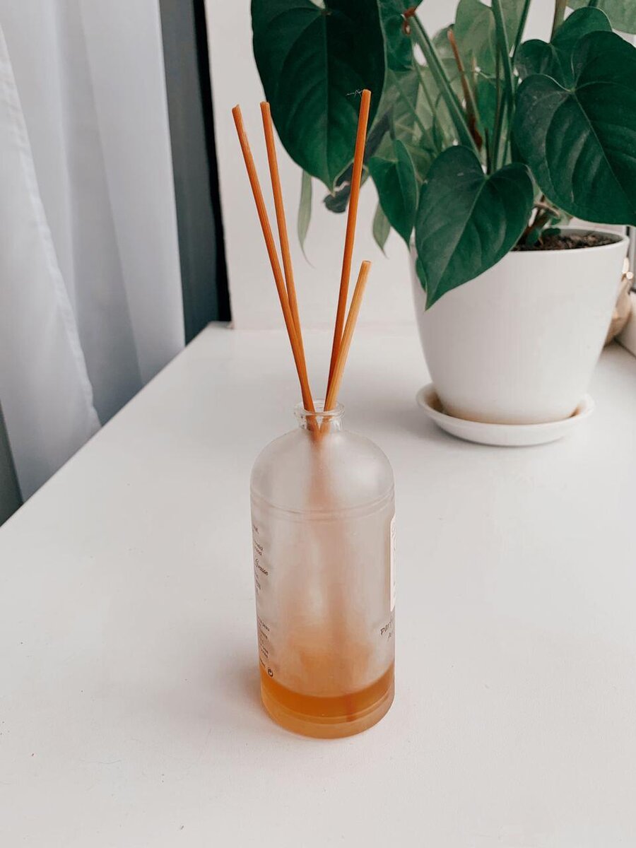 Вам понадобятся: парфюмированная баночка, шприц, деревянные шпажки для шашлычка. Берем баночку, отрываем колпачок, заливаем туда дистиллированную или кипяченую воду и с помощью шприца заливаем в емкость водицу. Далее, пропариваем деревянные шпажки в кипяченой воде. Берем несколько шпажек, четыре-шесть штук исходя из того сколько влезет в горлышко баночки. Деревянные шпажки будут служить проводниками аромата.