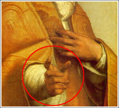 Я специально посчитала: ни у самой героини картины - Сикстинской Мадонны, ни у Папы Римского Сикста II на руках нет шести пальцев, а то, что выглядит на картине как шестой палец на правой руке Сикста II является частью ладони.