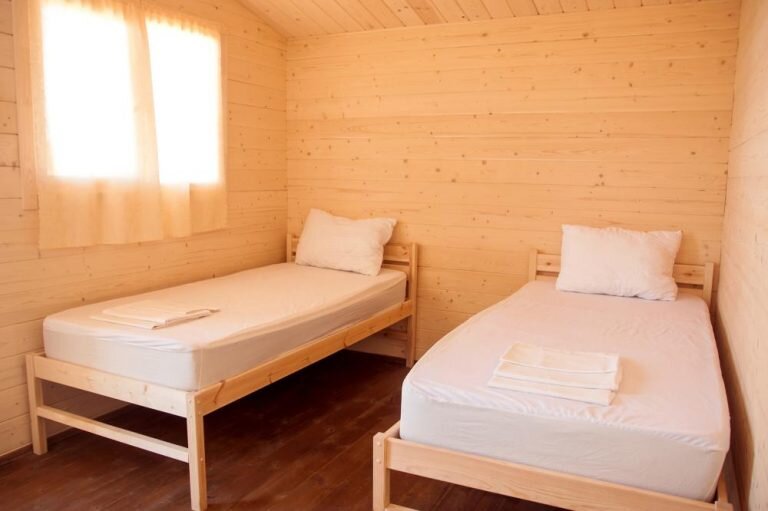 В домиках две односпальные кровати и кондиционер.