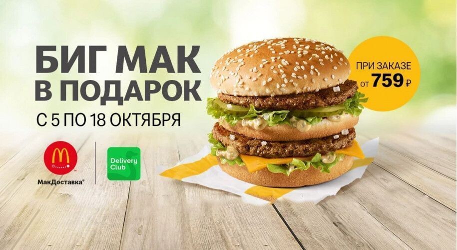 Макдональдс представляет новую акцию «Сделайте заказ от 759 рублей и получите Биг Мак в подарок». Акция действительна с 5 по 18 октября для заказов через приложение / сайт «Деливери Клаб» или через сайт «Макдональдс». Подробнее https://mcdonaldsmenu.ru/sales/big-mak-v-podarok-s-5-po-18-oktyabrya-2020-goda