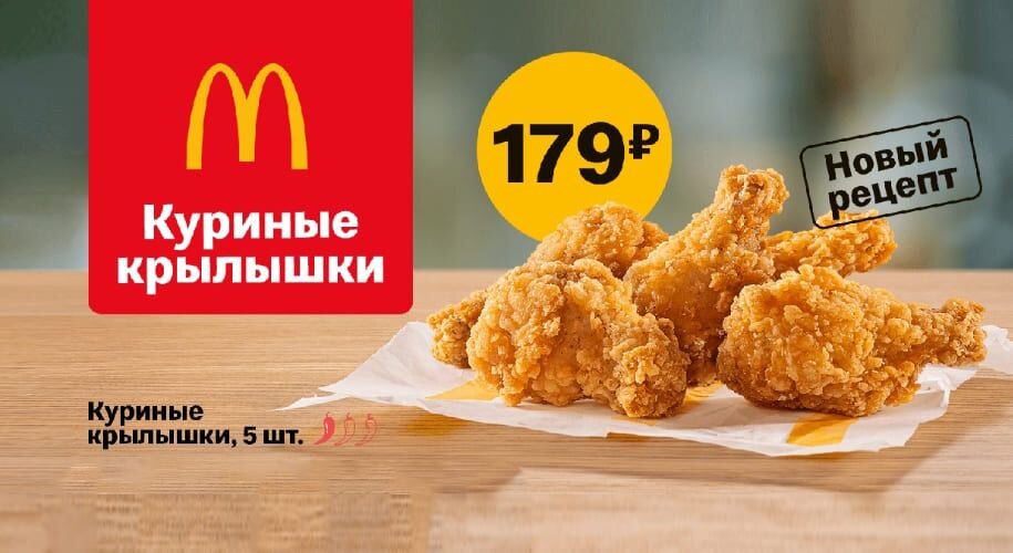 Попробуйте куриные крылышки в Макдональдс по новому рецепту в пикантной, хрустящей панировки из сухариков за 179 рублей. Подробнее https://mcdonaldsmenu.ru/sales/kurinye-krylyshki-5-sht-novyj-recept