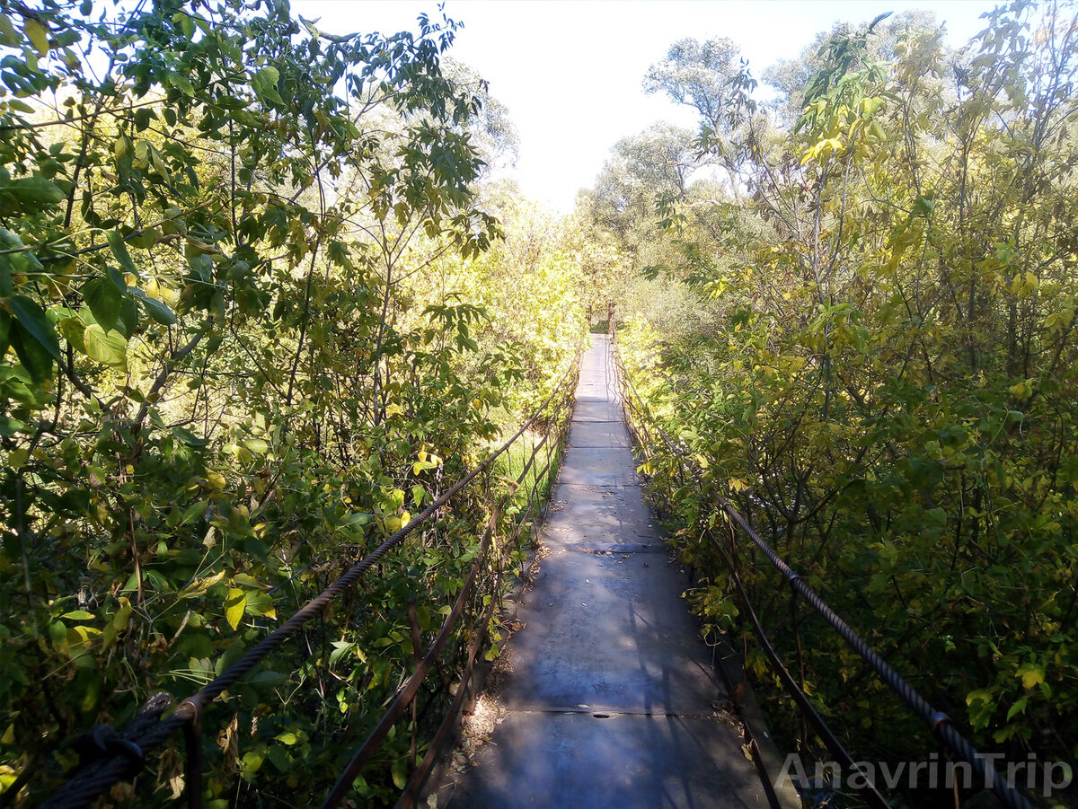 Сам мост металлический и очень напоминает самый длинный пешеходный подвесной мост в Черноземье, который перекинут через речку Девица, только покороче (метров 30-40). Он сварен на совесть, и металла не пожалели.