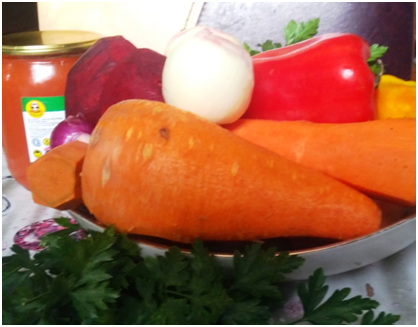 Сегодня нам потребуется свекла, морковь, болгарский перец , лук, чеснок, томатная паста, растительное масло, вода, столовый уксус, зелень, а так же лавровый лист и черный перец горошком.