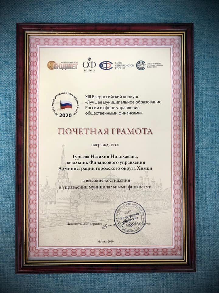 Администрация городского округа Химки Московской области награждена дипломами XIII Всероссийского конкурса «Лучшее муниципальное образование России в сфере управления общественными финансами». Конкурс состоялся при поддержке Союза финансистов России, под патронажем Совета Федерации Федерального собрания РФ.
