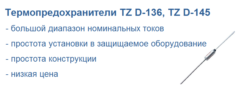 Термопредохранители TZ D-136 и TZ D-145 предназначены для защиты от перегрева и выхода из строя различного оборудования и компонентов, таких как мощные транзисторы, трансформаторы, электродвигатели и т.д. В отличие от обычных предохранителей, которые срабатывают при превышении заданного тока, термопредохранители срабатывают при превышении заданной температуры.