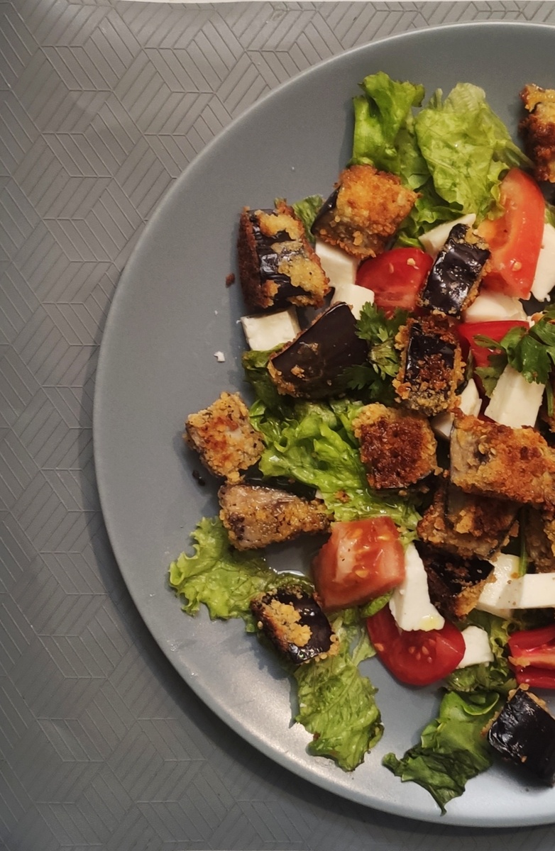 - Баклажаны нарезаем на крупные кубики, обмакиваем в сырое яйцо и обваливаем в панировачных сухарях. Обжариваем на раскаленном масле со всех сторон. Выкладываем на бумажное полотенце, чтобы впитался лишний жир.