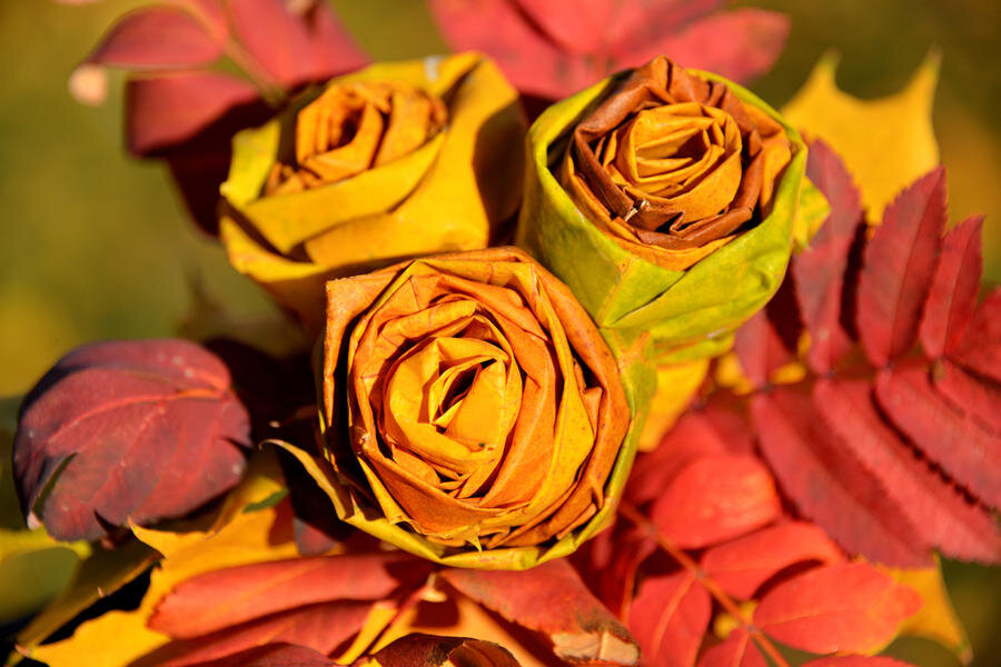 - Важно: выбирайте достаточно свежие листья, они более мягкие. А вот сухие будут ломаться и крошиться. Готовые цветочки можно собрать в букет.