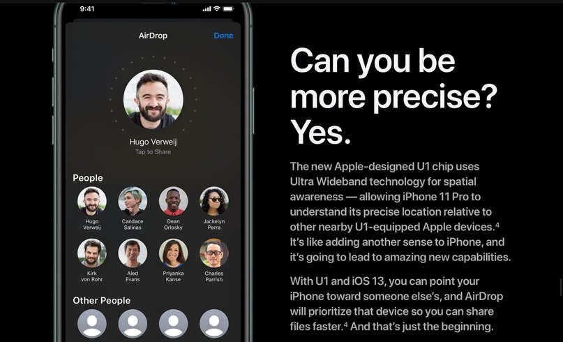 В новых моделях iPhone чип U1 совершенствует беспроводную передачу файлов по AirDrop. На осенней презентации 2019 года сказали, что для передачи файлов по AirDrop достаточно просто навести ваш iPhone на другое устройство с U1 чипом, тогда в списке устройств принимающего гаджета на первом месте появится имя передающего устройства и вы его без проблем найдете, даже если в помещении будет еще несколько человек с работающим AirDrop (объект идентифицируется с точностью до 10 сантиметров), при этом вам даже не потребуется подключаться к Wi-Fi.