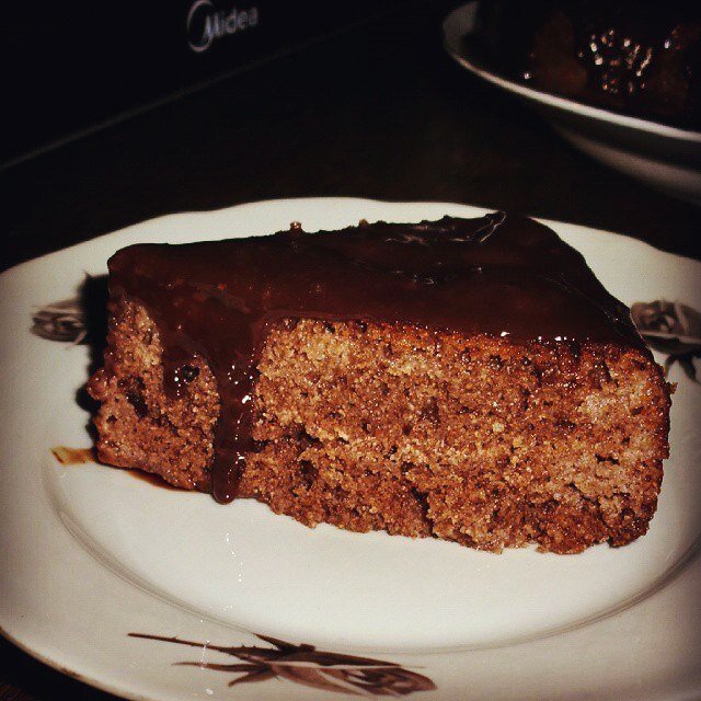Как испечется, выкладываем наш пирог на тарелку и прямо горячий пропитываем немного молоком. Прямо ложечкой выливаем на пирог, он впитывает хорошо. У меня ушла примерно половина стакана.