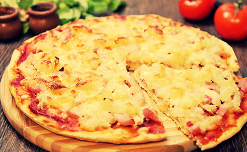 Здравствуйте! Хочу научить всех любителей готовки в домашних условиях как приготовить пиццу с красивым названием — «Гавайская», которая, что самое интересное, никакого отношения к этому острову не имеет. Такое название блюдо получило за состав начинки, а именно — экзотического ананаса. Не менее важным ингредиентом в данной пицце по классической рецептуре присутствует отваренное куриное мясо, а далее начинку можно дополнять по своему усмотрению. К примеру, я добавила ветчину для большей сочности, поскольку куриное филе все же суховато. Главным отличием гавайской пиццы от других стандартных вариаций является состав теста. Так, в гавайской можно использовать любой сорт масла, а в итальянском виде только оливковое. Мы будем готовить пиццу с добавлением масла оливкового. Блюдо в диаметре получается 28 см, по весу около 550 грамм. Хватит такой пиццы на 3 персоны. Что же, если вы любитель необычного сочетания сладкого ананаса с мясом, то пошаговый рецепт с фото подскажет как приготовить это блюдо: