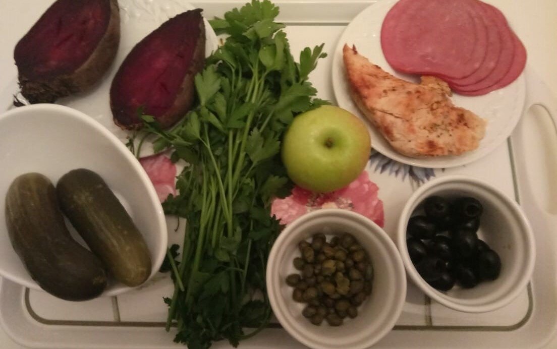 Рецепт несложный. Нарезать вареную говядину и курицу - можно взять остатки мяса от других блюд, нарезать свеклу, яблоко, огурцы, мелко изрубить каперсы и 5 веточек петрушки. Приготовить заправку из оливкового масла, лимонного сока, горчицы, соли и перца. Заправить овощи.