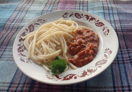 Примечание. В соусе к макаронам проглядывают некие кусочки. Это не мясо. В качестве его имитации я нарезал кусочками морковь и обжарил ее вместе с луком.