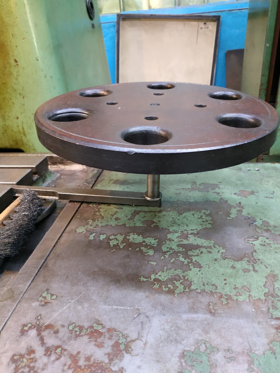 Для начала ровный круг определенного размера я выточил на токарном станке, по центру сделал резьбовое отверстие и просверлил несколько равно расположенных отверстий большего и меньшего диаметра. После чего вставил готовый круг в
