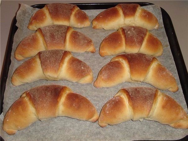 Затем раскатать часть теста в круг, смазать повидлом или любым вареньем на ваш вкус, оставив сухими края и порезать на секторы — крупные или мелкие, как вам нравится. Теперь скатайте рогалики и выкладывайте на посыпанный мукой противень.