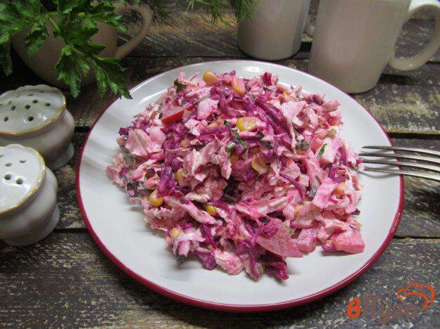 Покрошенный мелкими аккуратными полукольцами лук выложите в миску. Нарежьте капусту тонкой соломкой и добавьте к луку, после чего влейте сок одного лимона. Все тщательно помните и перемешайте. Очищенную запеченную свеклу натрите соломкой и добавьте к капусте и луку. Туда же отправьте кукурузу, все хорошо перемешайте. Сдобрите салат немного растительным маслом или майонезом, кому как нравится, и добавьте перец, соль и сахар – количество выбираете сами.