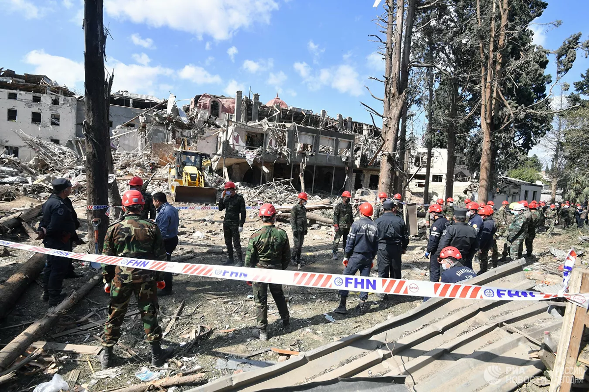 Сотрудники МЧС Азербайджана на месте разбора завалов разрушенных домов после ракетного обстрела города Гянджа