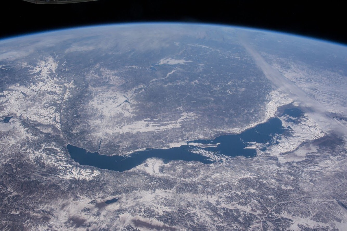 Из космоса можно наблюдать как на льду озера Байкал видны темные кольца диаметром 5-7 километров.