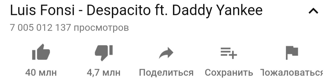 популярным роликам на youtube да и во всем интернете в принципе музыкальный контент смог первом в истории видеохостинга набрать 5 миллиардов просмотров затем шесть миллиардов и вот вчера новый рекорд 7 миллиардов