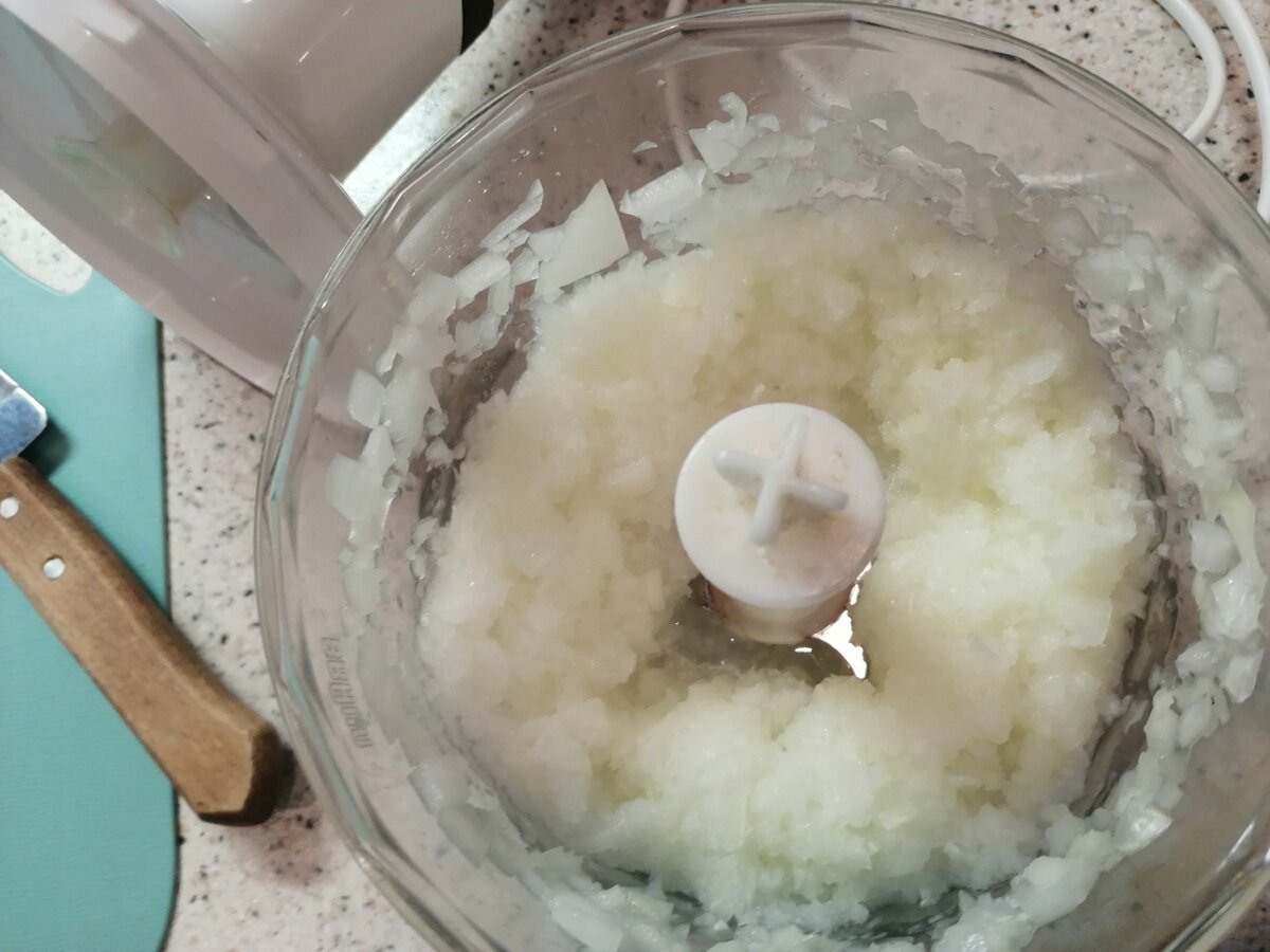 Чистим две луковицы и нарезаем мелко, можно в блендер закинуть.