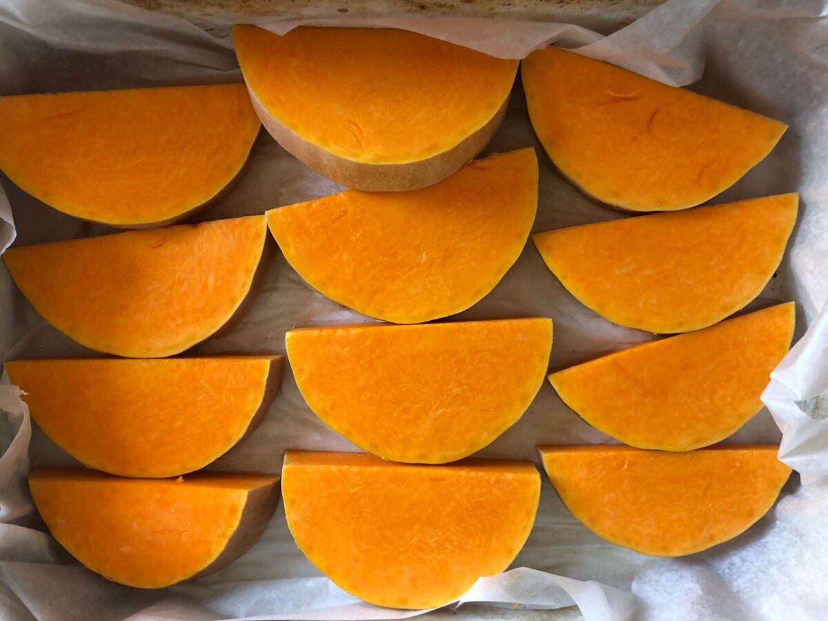 - Форму застелить пергаментом, слегка смазать растительным маслом и выложить тыкву.