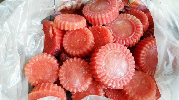 Снимаем с помидор шкурку (можно этого и не делать), перекручиваем на мясорубку или измельчаем в блендере, перекладываем пюре в формы и ставим на пару часов для замораживания в морозилку. Потом все эти помидорные формы просто храним в пакете.