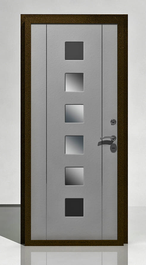 · Остальные детали входной двери — ручки, петли, замочная скважина, также оформляют в «металлических» оттенках. Финишное покрытие может быть матовым или глянцевым.