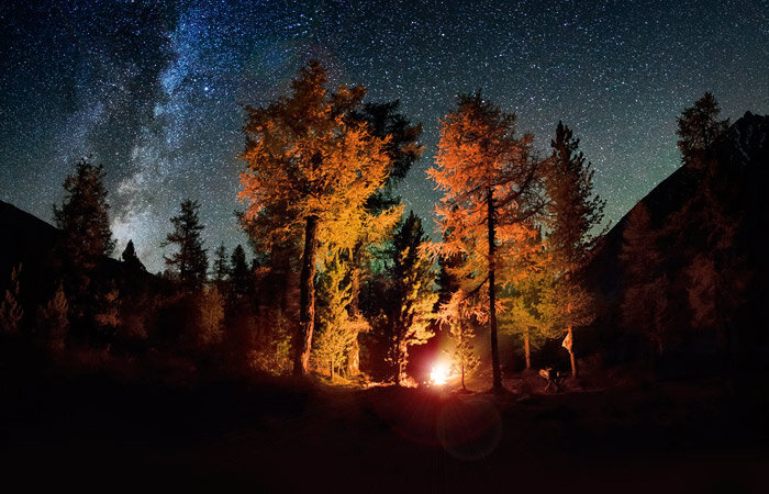Глаза проводника блеснули в свете костра между вспухших век. Сухие ветки уютно потрескивали, и легкий беловатый дым поднимался в небо, припудренное мелкими звездами, как мукой, пропадал в невидимых кронах окруживших полянку сосен