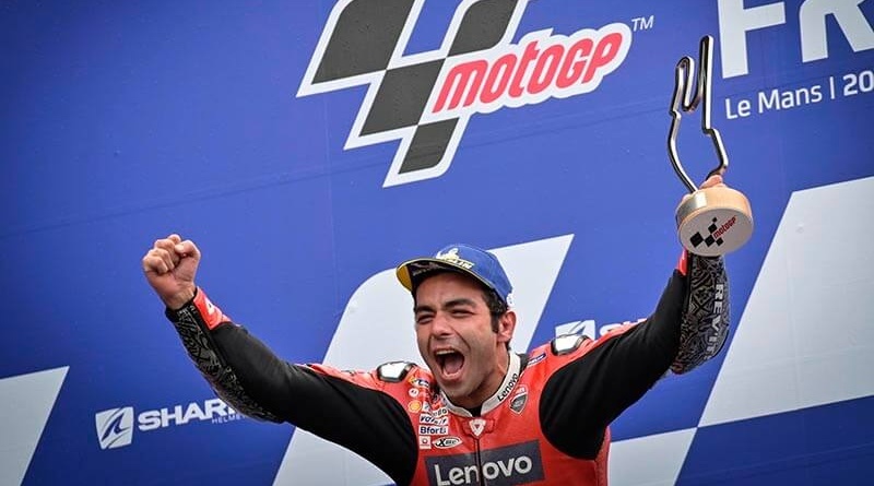 Заводской гонщик «Ducati» Данило Петруччи выиграл свою вторую гонку Moto GP на мокрой трассе в Ле-Мане во время Гран-при Франции.