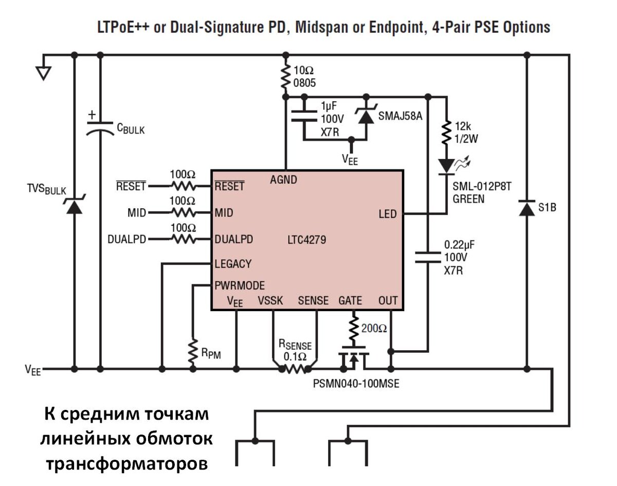 Вот типовая схема источника PoE IEEE 802.3bt – контроллер, регулирующий транзистор, обвязка – все вместе порядка 8-10 долларов. Монтаж простой, но тоже денег стоит, проверка ОТК опять же нужна.