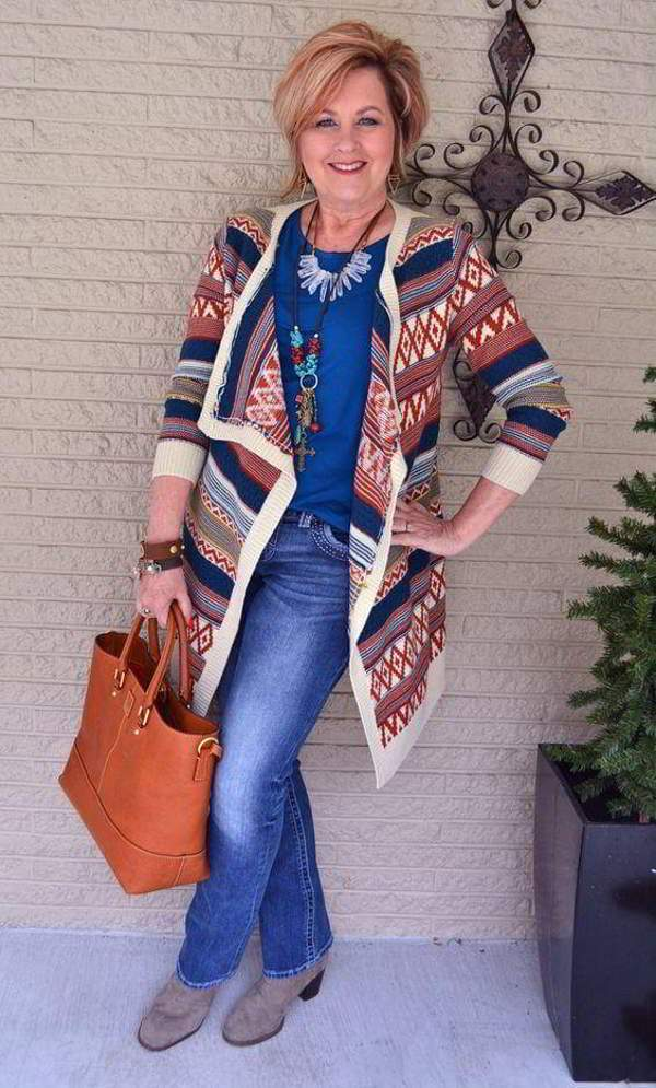 - Еще один вариант повседневного образа, на этот раз с джинсами. К синим джинсам выбран темно-синий джемпер и Свободный кардиган с абстрактными узорами в темных оттенках красного и синего цвета. Оригинальное колье и замшевые ботильоны дополняют образ.