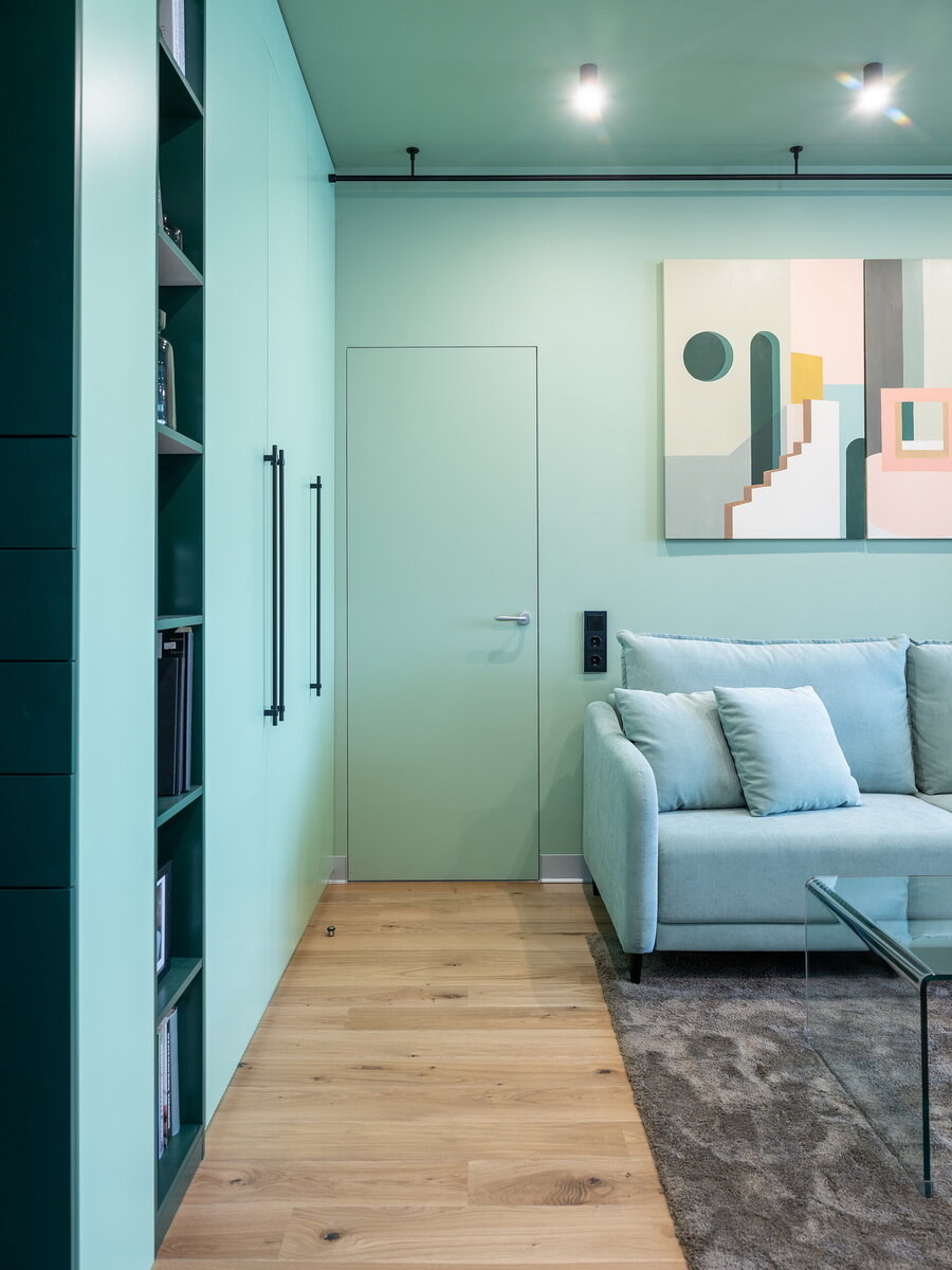 Раздвижные перегородки CRISTAL и двери-«невидимки» от UNION в интерьере фисташковой гостиной в программе «Квартирный вопроса». Перед дизайнерами стояла задача создать комфортный интерьер сразу из трех зон – прихожей, гостиной и спальни на 20 (!) квадратных метрах. Удалось? Еще как. И в этот раз двери и перегородки UNION сыграли ключевую роль в создании гармоничного и функционального пространства для семейной пары из подмосковного города Люберцы. Итак, благодаря раздвижной прозрачной перегородке CRISTAL в профиле цвета «Шампань», состоящей из 4-х створок, были разделены спальная зона и гостиная. Причем принципиальным вопросом для дизайнера проекта была максимальная прозрачность перегородок, так как важно было сохранить естественное освещение в помещении и не закрыть прекрасный вид, открывающийся из окна. Модель CRISTAL стала идеальным решением. Две стационарные центральные створки сочетаются с двумя раздвижными по бокам, которые бесшумно перемещаются по верхним направляющим. Повышенна