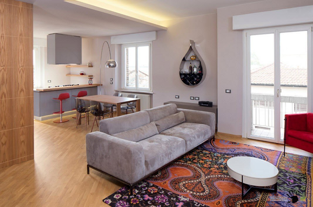 - площадь можно зонировать, поставив мягкую мебель или стол со стульями в центре.