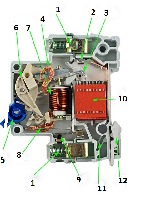 Поз. 1 – клеммы. Верхняя – для подводящего провода, нижняя – для идущего к нагрузке. Входная клемма соединяется с неподвижным контактом – поз. 2, работающим в паре с подвижным контактом – поз. 3. Замыкание и размыкание этих контактов определяет коммутацию или разрыв цепи. На приведенной картинке автомат находится в выключенном положении. Внутренняя коммутация помимо токопроводящих металлических деталей, осуществляется при помощи гибких проводников – поз. 4. На фронтальной поверхности автомата расположен рычажок включения-выключения – поз. 5. Верхнее положение соответствует позиции «вкл.», нижнее – «выкл.». Рычажок через рычаги, пружины и стопоры – поз. 6 смыкает и размыкает подвижный контакт – поз.3 с неподвижным – поз. 2. Подвижный контакт подпружинен. При воздействии на стопор, под действием пружины, контакт автоматически разомкнётся. Воздействие на стопор осуществимо тремя способами: