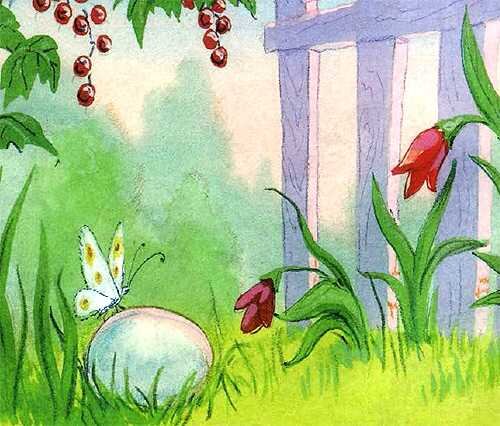 Первый солнечный луч пробежал по дорожке, перепрыгнул через забор и заглянул под смородиновый куст. Там на зелёной траве лежало яйцо.
