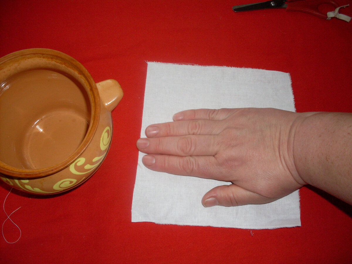 Вам понадобится белая ткань (желательно лён, но можно и бязь, ситец). Длина этой ткани это высота горшка или кастрюльки (плюс 2 см. на припуск), а ширина - длина ладони.