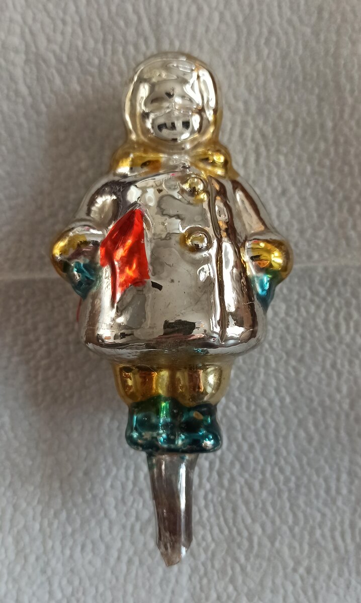 Я очень люблю серию детей в советских ёлочных игрушках. И есть среди них те, которых я очень мечтаю иметь у себя в коллекции. Однако не всегда это дешёвые экземпляры. Так было и с этой игрушкой - девочку с флажком найти в хорошем качестве и с красивым личиком дёшево практически нельзя. И вот среди игрушек за небольшую цену мне попалась она. Девочка с флажком, точнее то, что от неё осталось. Стекло в полном порядке, но от краски, как видно, сохранилось не многое. Лица вообще не было изначально. Я увидела её и тут же забрала. Опыта с прорисовкой лиц у меня не много, но я решила попробовать. Для начала спросила в группе коллекционеров, почему такая длинная трубочка у игрушки. Высказали предположение, что это или Культигрушка или просто брак (забыли отрезать). В группе мне так же дали фото для примера - автор фото А.Косенков. В каталоге эти девочки тоже есть, но фото менее четкое, потому я и попросила дать мне подсказки. И я решила сделать свою похожую на Культигрушку девочку. Для нача