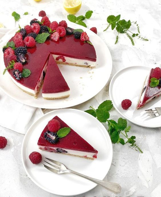 7 Берем кастрюлю и сито и протираем ягоды для ягодной заливки.Ставим на огонь, добавляем сахар, крахмал и лимонный сок и даем хорошо закипеть, должны быть пузырьки от кипения.Минут 10 даем остыть, все время помешиваем а то застынет.Достаем из холодильника наш торт и выливаем нашу красивую, ароматную смесь.Опять в холод на 2 часа и потом сверху украшаем оставшимися ягодами и листиками мяты.