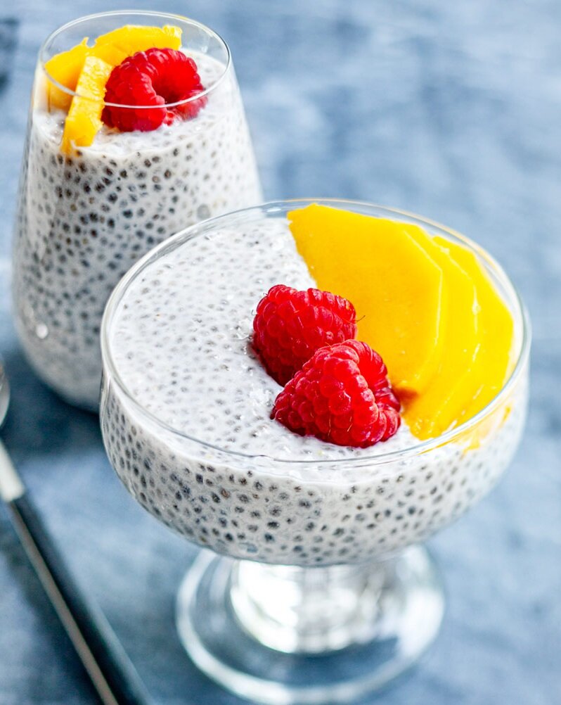 Разложить загустевший десерт в две чашки или стаканы и добавить свежие фрукты.