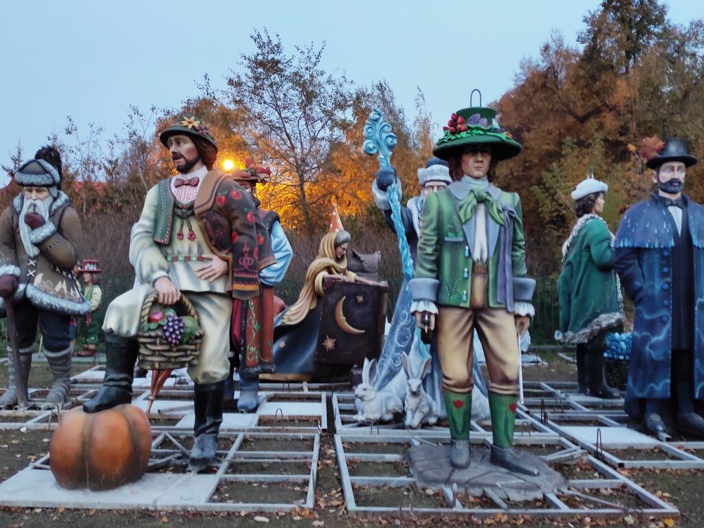 На прошлой неделе прокатились на велосипедах по лесопарку Кузьминки. И тут нас ждал сюрприз: то ли у деда Мороза ремонт - и лишнюю «мебель» выкинули пока на «балкон», то ли еще какие-то события в его усадьбе, но вот такие замечательные фигурки оказались собраны целой толпой на площадке возле усадьбы.