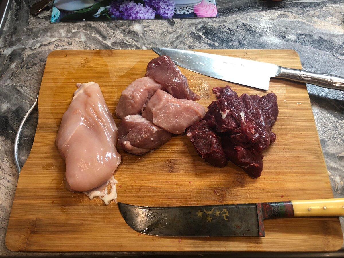 Начнем мы с фарша. Как это ни странно. Обычно тесту требуется отдых, для набухания клейковины. Но не в этом случае. В отсутствии медвежатины ( ну, не завезли в соседний магазин сегодня), у меня фарш будет состоять из свинины, говядины, курицы. Курицы должно быть не более 30 процентов от общего объёма, иначе «забьет» вкусом. Нарезаем на мелкие полоски, потом на мелкий кубик, потом рубим двумя топориками ( ножами). Помните как курицу на шаурму разделывают? Ну, вот примерно так: