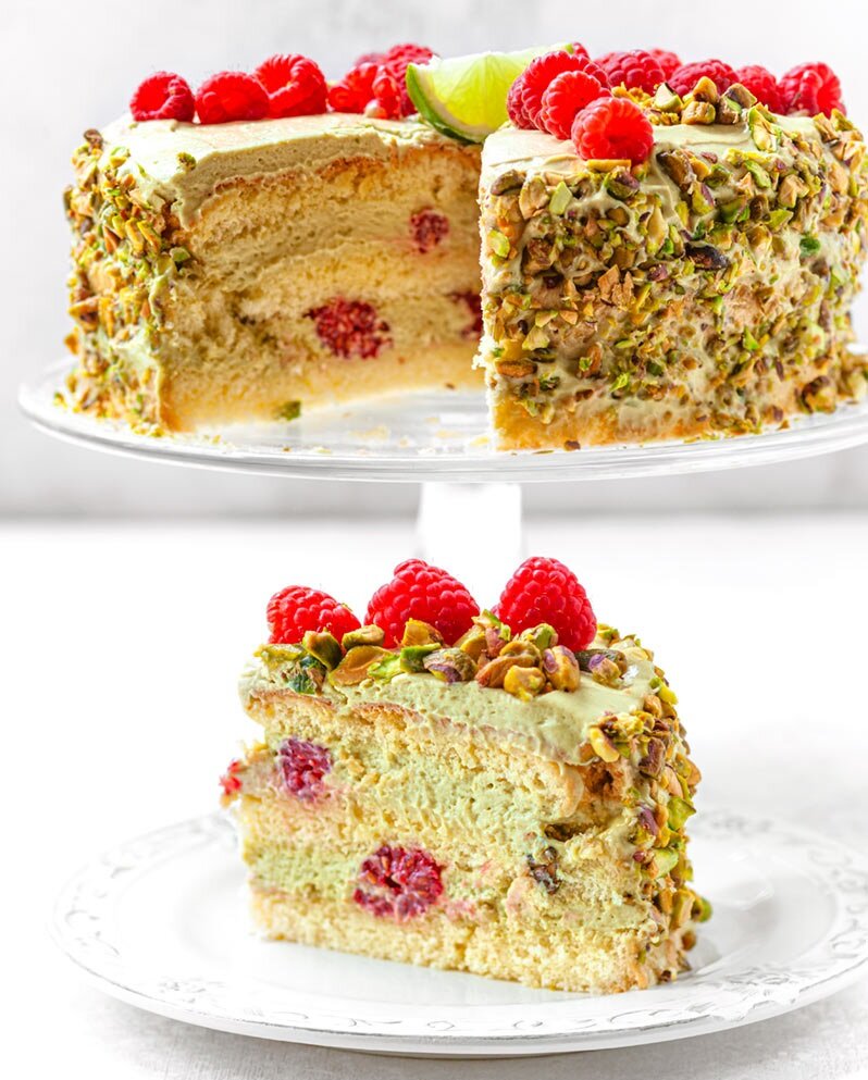 Повторите то же самое с остальным печеньем, сливками и малиной. Украсить измельченными фисташками и малиной. Вместо фисташек бока торта можно застелить бисквитной крошкой.